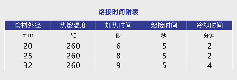 将热熔器加热至260℃(请注意严禁超过265 ℃),迅速将水管及接头无旋转地同时推入热熔头加热,热熔时间见附表。